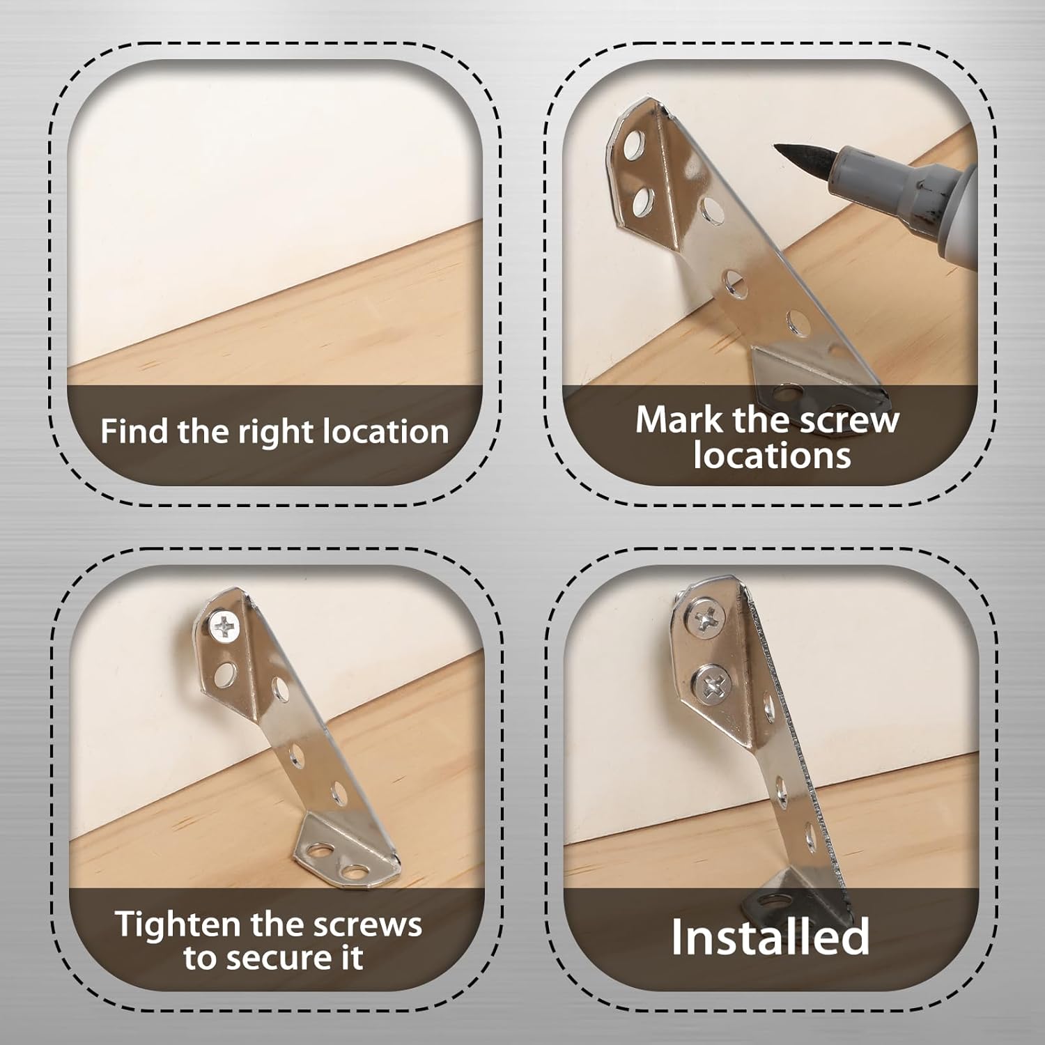 Features: Bulk package for your needs: Our package includes a generous amount of 50 triangle shelf brackets along with enough matching screws, ensuring you'll have enough brackets for large projects or for storing extras for future use. Sophisticated appeal for your furniture: With a silver color, these metal angle brackets not only serve a functional purpose but also add an aesthetic touch to your furniture. Its brushed surface successfully resists daily corrosion, scratches, and tarnishing, maintaining its appealing shine over a longer period. Specifications: Material: stainless steel Color: silver Size: Thickness: 2mm/0.07", Length: 65mm/2.6", Width: 30mm/1.2", Hole Distance: 17mm/0.7", Hole Diameter: 5mm/0.2", Corner Width: 28mm/1.1" Package includes: 50 x Corner braces with screws Notes: Manual measurement, please allow slight errors on size. The color may exist a slight difference due to different screen displays. Small items include, choking hazard may exist, please keep our product away from little ones. What you receive will be the parts of the product, which need to assemble by yourself before use. Pointed items are included, please be careful when using and please keep them away from kids.
