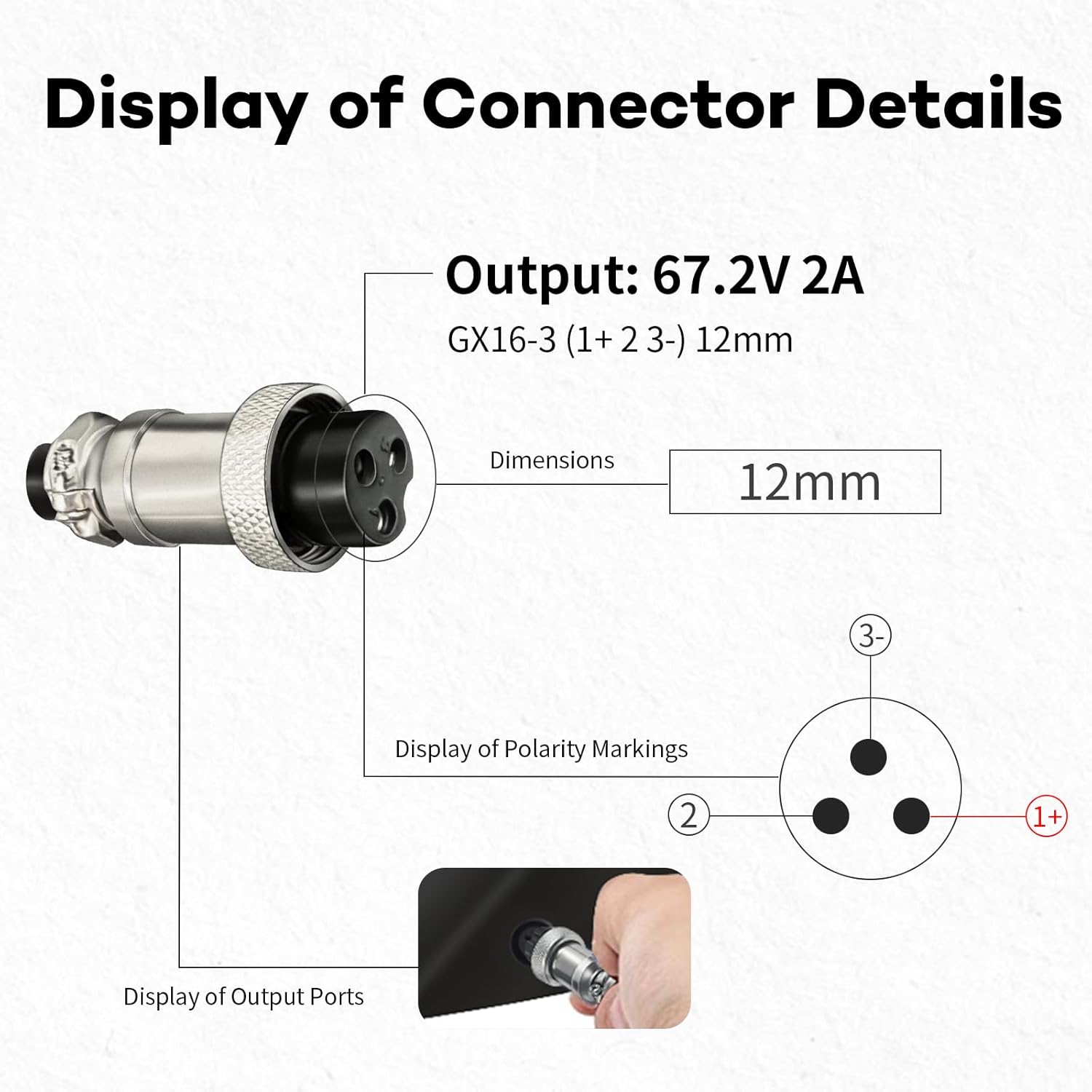 Input Voltage: 100-240Vac 47-63HZ Operating Temperature: -20℃~+50℃ Charge Method: CC/CV Efficiency: >87% Product Size: 143*60*40mm Warranty: 12 months Case Material: PC Material UL94VO The indicator of LED: "Red" charing, "Green" full N.W: 0.43kg