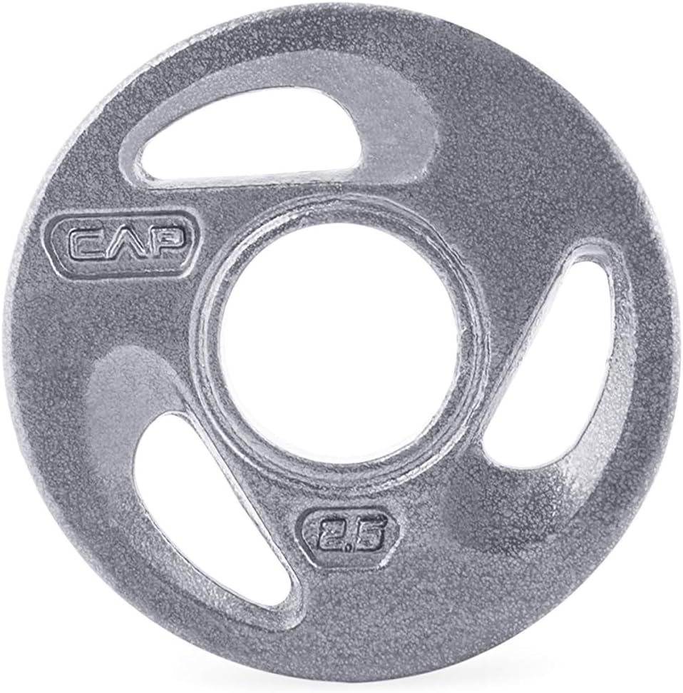 Increase the intensity of your workout with the cap 2 in Olympic grip plate. It makes an exceptional addition to your weight lifting routine. The single cap plate is made of solid cast iron. Each piece features over-sized holes. This allows the user to safely lift and load the plate onto the bars and other equipment. Additionally, it has a semi-gloss finish and convenient grips for added control. The weight is clearly marked with a contrasting silver color. This cap 2 in Olympic grip plate fits on all 2 in Olympic style Weightlifting bars, along with many other machines. The weights are available and sold separately in a 2.5 lb, 10 lb, 25 lb or 45 lb size