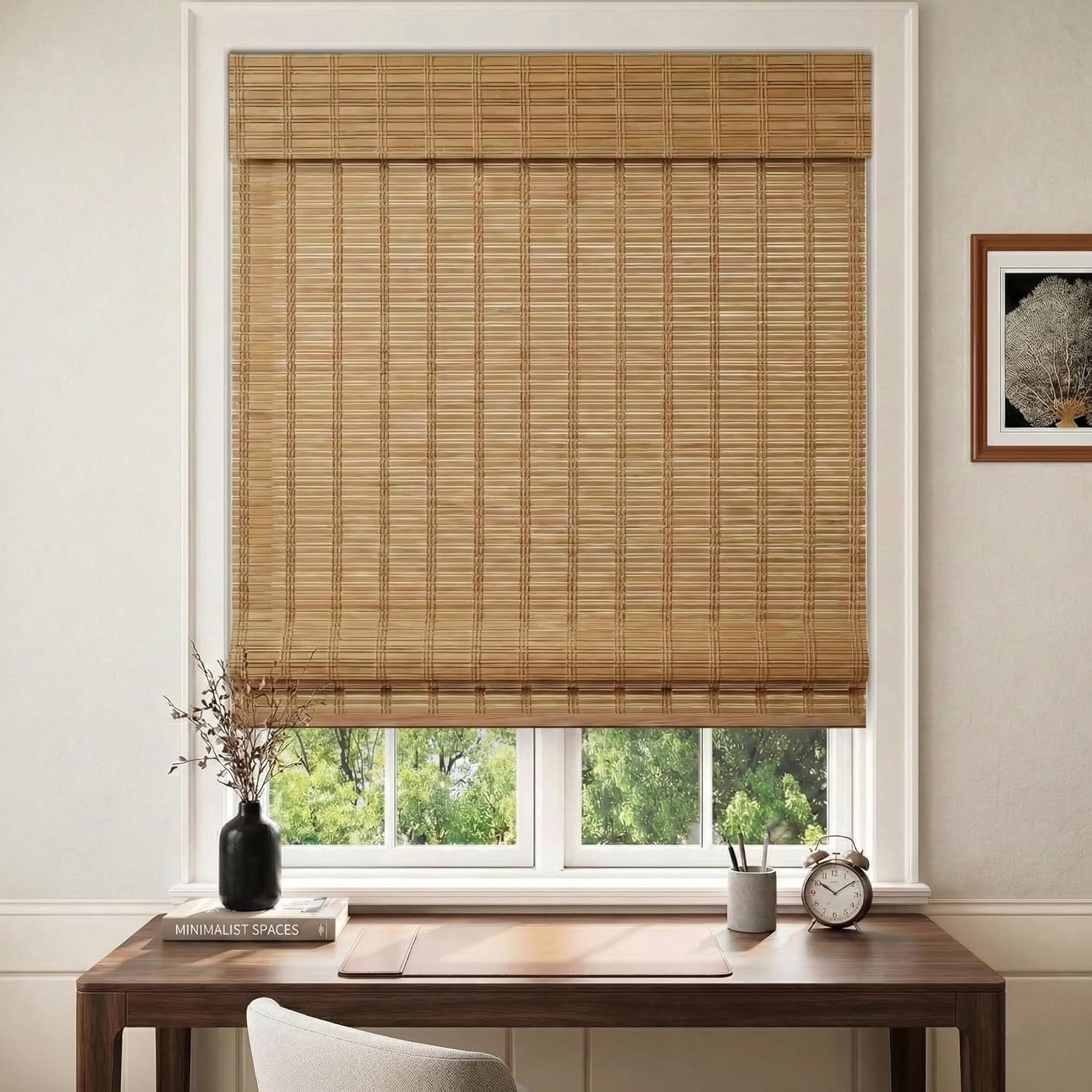 Refresh your home décor with the timeless texture and warmth of our Cordless Bamboo Roman Shades. Inspired by the natural beauty of woven wood, these shades offer a sophisticated upgrade to standard blinds. Whether you are aiming for a modern farmhouse look, a coastal vibe, or a minimalist aesthetic, the rich, natural tones provide a stunning focal point for any room. Advanced Cordless Safety System Designed with your family’s safety in mind, our shades feature a state-of-the-art cordless lift mechanism. We remove potential hazards for children and pets, offering you peace of mind. This clean, cordless design also provides a sleek, uncluttered appearance that elevates the look of your windows. Operation is effortless: simply hold the bottom rail and push up or pull down to adjust the shade to your exact desired height. Perfect Light Filtering & Privacy Enjoy the perfect balance of sunshine and seclusion. our bamboo shades are designed to gently filter light. The natural woven slats reduce glare and block harsh direct sunlight—protecting your furniture and floors from fading—while still allowing soft, diffused daylight to brighten your space. The semi-opaque texture provides essential privacy from the outdoors without completely darkening the room, making them ideal for living rooms, kitchens, and home offices. Quality Craftsmanship & Design Crafted from high-quality, durable bamboo materials, these shades are built to last. The neat, tight weaving ensures a uniform look, while the integrated matching valance elegantly conceals the mechanical headrail for a polished, custom-made finish. Hassle-Free Installation We believe home improvement should be simple. Our shades come with all necessary hardware and clear instructions for easy setup.