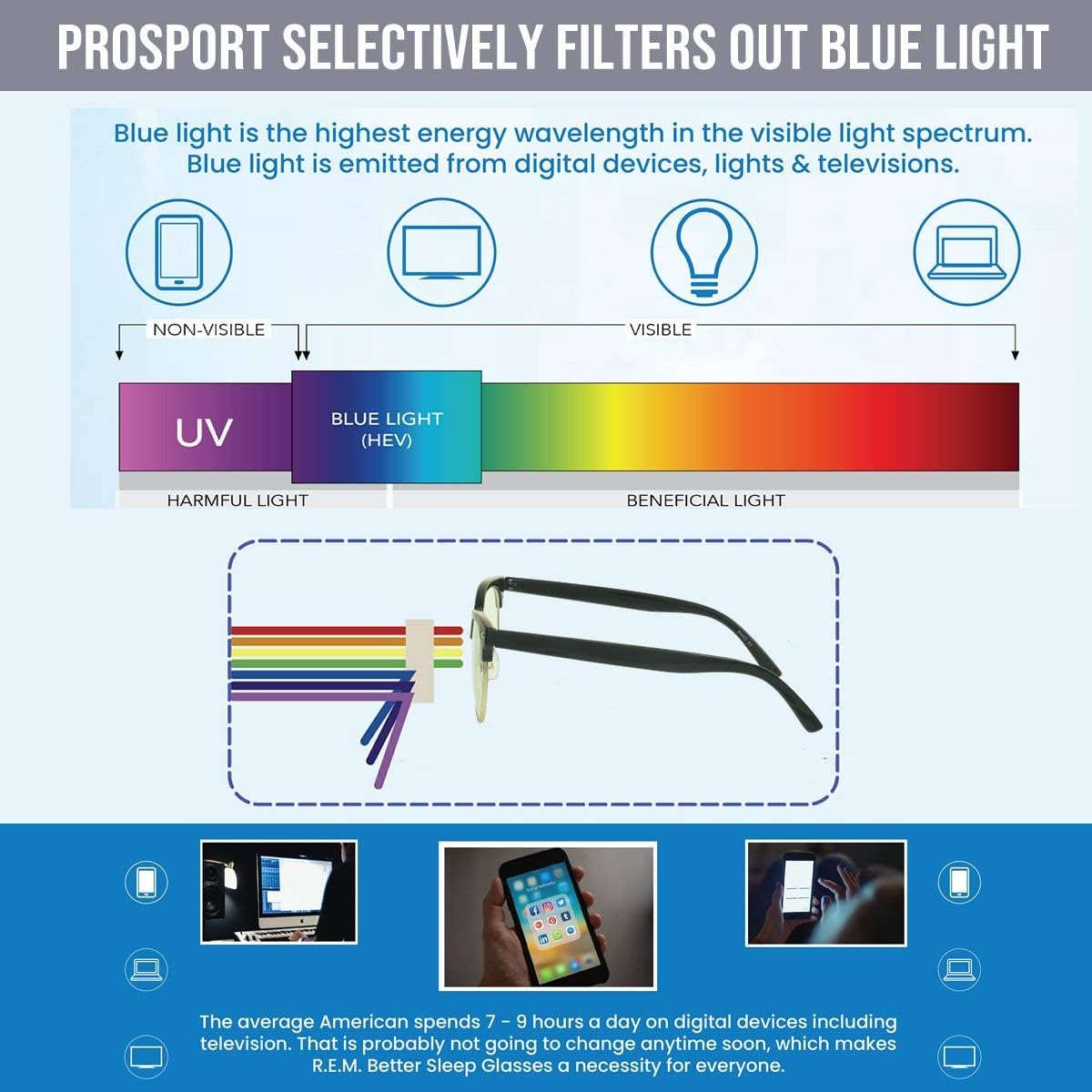 Whether you are a serious gamer, or only spend a couple hours of day in front of the computer, you really can't afford not to wear these proSPORT blue light blocking glasses. Wearing anti blue light glasses to protect eyes from computer is one of the best decisions you can make to protect your eyes from harmful effects of blue light. You will feel the incredible difference. These glasses help prevent dry irritated eyes, watery eyes & most importantly, the long term damage caused by blue light from computer screens. If you are having trouble sleeping or experiencing very light sleep, the answer to your sleep problems could be proSPORT bluelight blocker computer glasses designed with proven blue light blocking lenses.You see, exposure to artificial light at night from computer screens, cell phones, tablets, television, leds, fluorescent lights and incandescent lights inhibit melatonin production, the hormone that tells your body it's time to sleep. Without melatonin, your body's biological clock, the circadian rhythm, believes its daytime and NOT night time. The result is insomnia and disrupted sleep. Blue light naturally boosts attention, alertness and mood. So, naturally, it's a good idea to block out blue light before you sleep.Studies at Harvard Medical School, University of Toronto, JAAMA Neurology and the American Macular Degeneration Society all show that exposure to blue light disrupts melatonin production leading to irregular sleep patterns. We all know that NOT using your phone, NOT watching tv, or walking around in total darkness in your house is totally not possible! So, the only way you can realistically limit exposure to blue light is to wear these pc glasses. Without exposure to blue light, your body will adjust itself to the night. proSPORT Glasses have 100% UV protection. So, you can wear these blue filter glasses all day long.